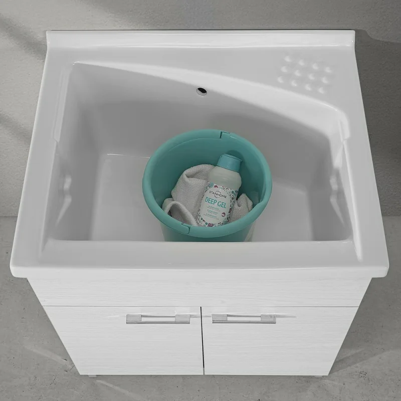 Il mobile lavanderia 75x60 cm Linea Revine con lavatoio in ceramica Dolomite unisce stile e praticità. Con due ante, piedini e una vasca Made in Italy resistente e facile da pulire, è la soluzione ideale per una lavanderia ordinata e funzionale.