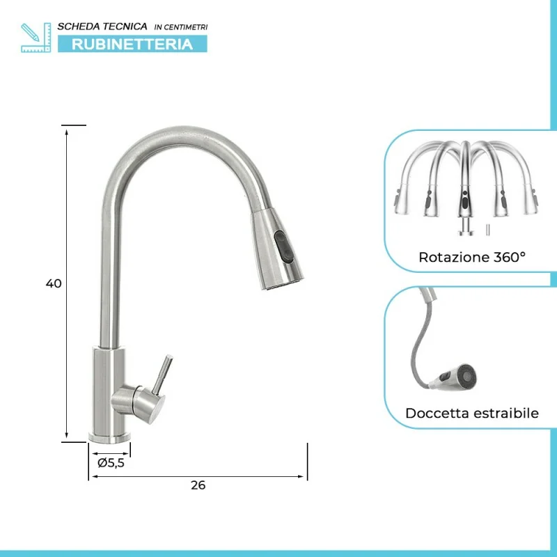 Miscelatore cucina monocomando con canna alta orientabile,doccetta estraibile a 2 getti
