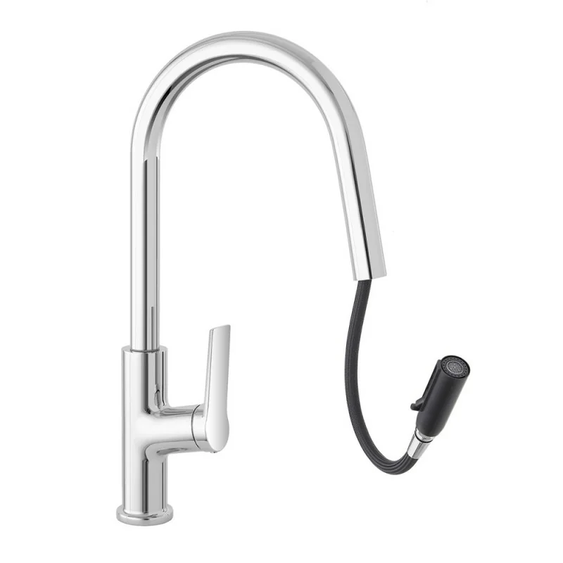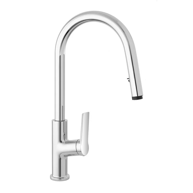 Con le sue linee morbide e il design essenziale, questo miscelatore si integra perfettamente in qualsiasi cucina, offrendo un equilibrio ideale tra estetica e funzionalità. Realizzato in acciaio inossidabile con finitura cromata, è dotato di canna alta orientabile e comoda doccetta estraibile a due getti.