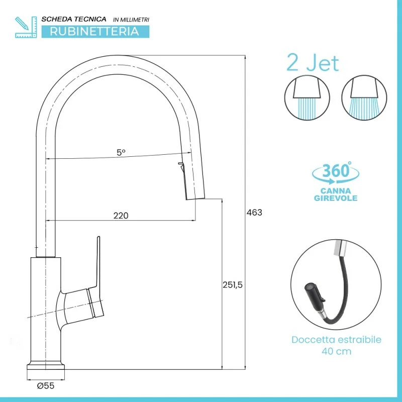 • Canna alta e orientabile; doccetta estraibile con 2 getti;