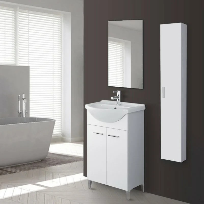 Mobiletto bagno a terra 56 cm bianco lucido con lavandino e specchio inclusi