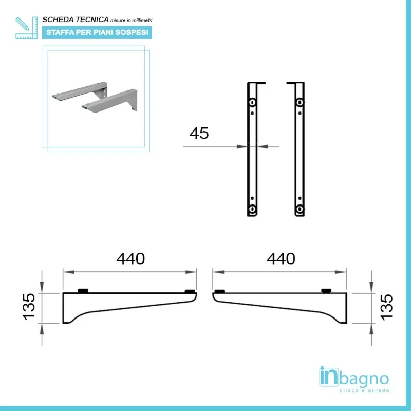La coppia di staffe ha profondità 44 cm e altezza piastra per fissaggio a muro pari a 13,5 cm. Per il fissaggio di mobili sospesi da 60 a 110 cm si consiglia l’acquisto della coppia proposta.