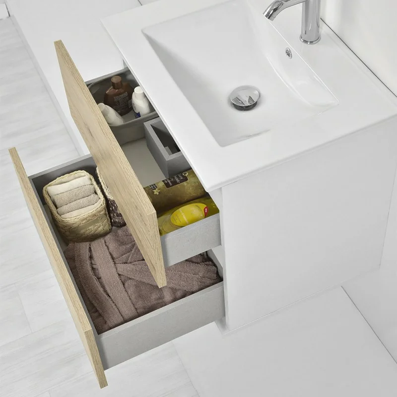 Il mobiletto bagno sospeso Duble arricchisce con grazia e raffinatezza il proprio ambiente bagno,mettendone in risalto i tratti contemporanei e attuali. Il mobiletto sospeso è completo sia di lavandino in ceramica bianca lucida che di specchiera filo lucido,60x80 cm,dall'installazione reversibile. Il mobiletto bagno salvaspazio è composto da due pratici cassettoni con chiusura ammortizzata soft close e sistema di apertura mediante maniglie a gola. Il cassetto superiore è comprensivo di salvasifone per lavabo,che permette una distribuzione ordinata e sistemata dei propri accessori da bagno.