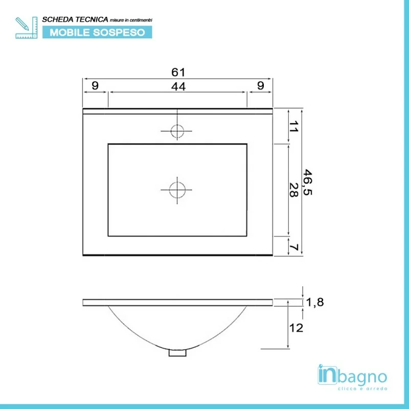 • Dimensioni vasca lavabo:L 61 x P 46,5 x H 1,8 cm;