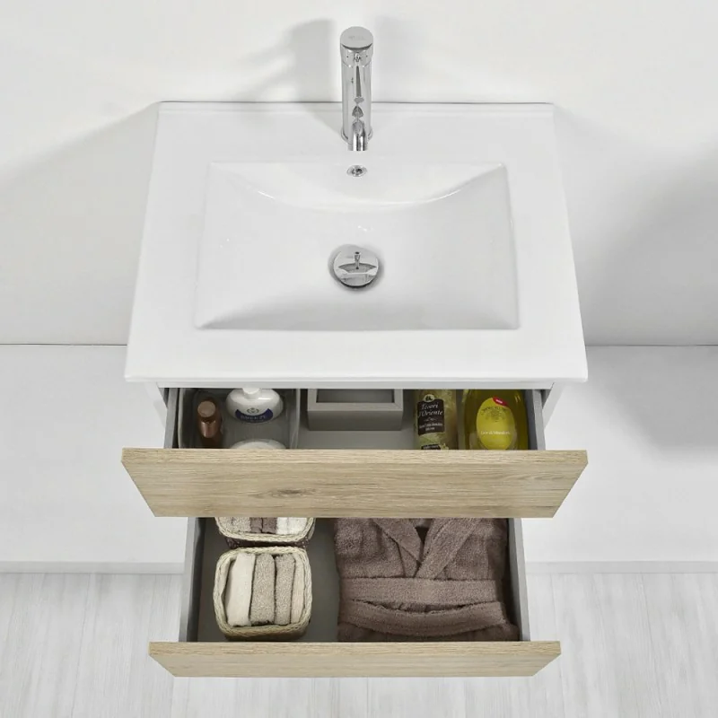 Mobile bagno moderno sospeso 60 cm serie Duble rovere africa con 2 cassetti a chiusura rallentata soft-close completo di ceramica bianca lucida e specchio reversibile
