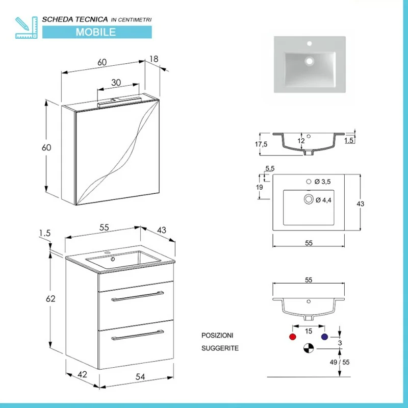 • Dimensioni lavabo in ceramica:L 55 x p 43 x H 1.5 cm – Profondità vasca 12 cm - Peso 10 kg;