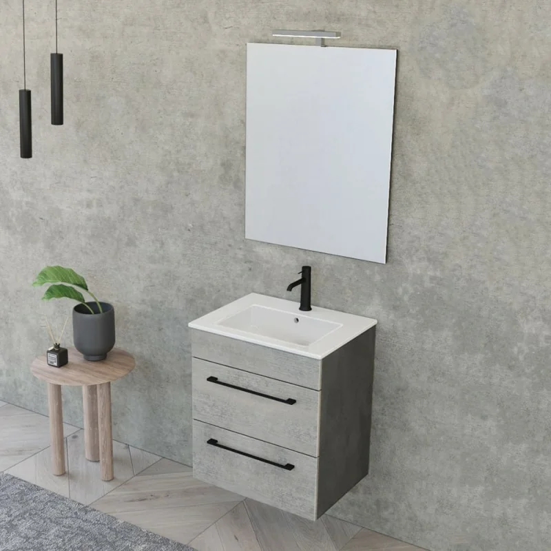 Mobile bagno sospeso – Smart 55 cm grigio cemento effetto legno e fianchi grigio lava con specchio