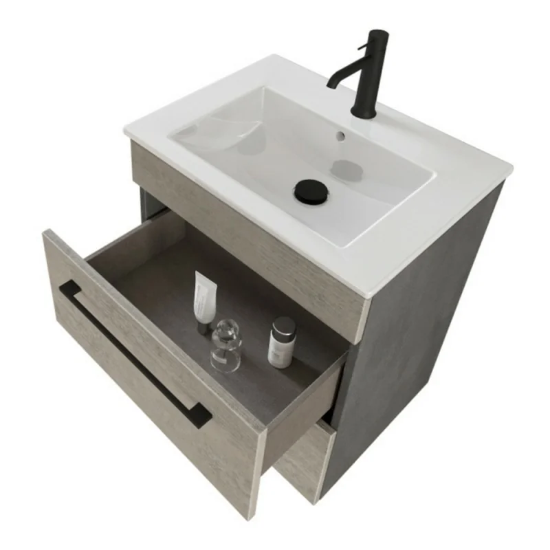 La base da 55 cm ospita 2 cassetti a chiusura ammortizzata soft close e apertura con maniglie in metallo cromato lucido. Ai frontali colore grigio effetto legno si contrappongono i fianchi grigio lava per dare un effetto moderno all’arredamento. Il mobile viene fornito già montato ed il fissaggio a parete risulta facile e veloce:all'interno della confezione viene fornito un QR code con link ad un video illustrativo del processo di fissaggio.