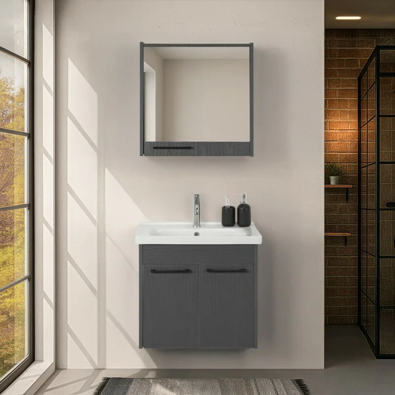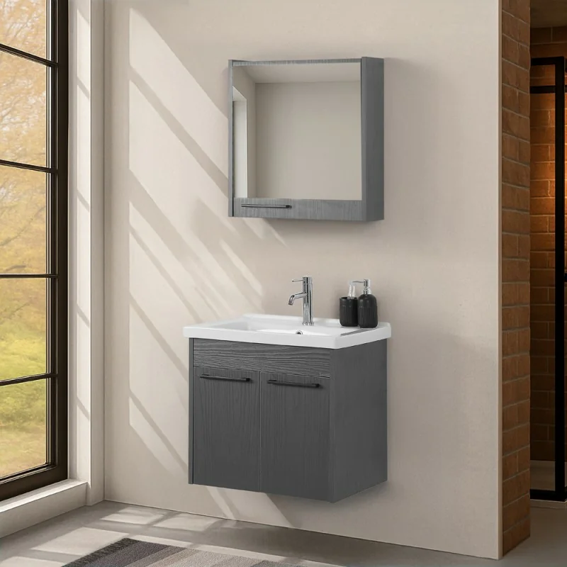 Mobile bagno sospeso – L 65 cm serie Sofia colore grigio effetto legno con 2 ante soft-close, lavabo e specchio contenitore