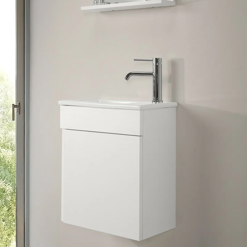 Mobile bagno sospeso salvaspazio serie Mini colore bianco lucido con anta, lavabo in ceramica e specchio con mensola