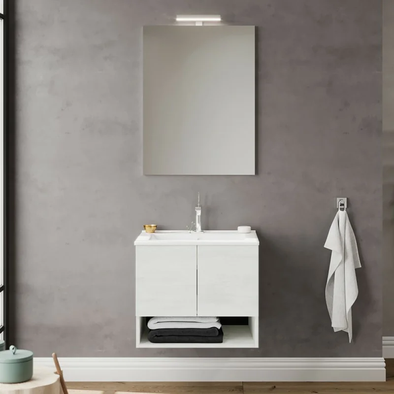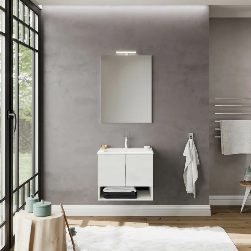Mobile bagno sospeso – 60 cm in legno nobilitato con 2 ante e vano a giorno,lavabo in ceramica e specchio LED
