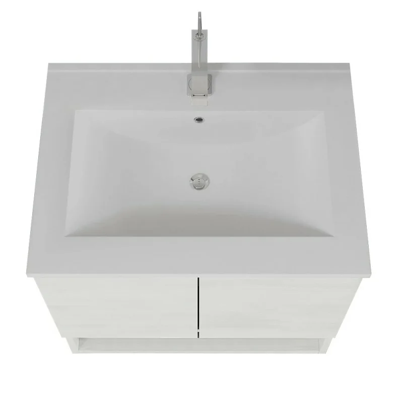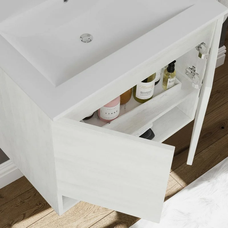 Il mobile è in legno nobilitato con finitura rovere bianco,caratterizzato da due ante con chiusura soft close e un vano a giorno particolarmente capiente e spazioso. La base ospita un lavabo in ceramica di primissima qualità,con vasca centrale,foro miscelatore e troppo pieno.
