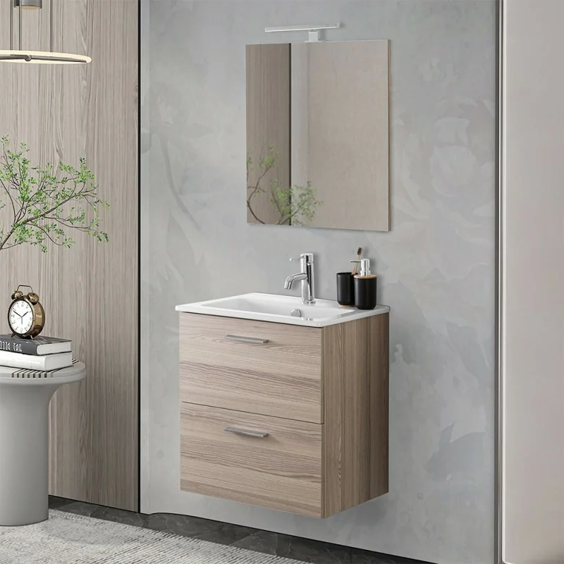 Mobile bagno sospeso – in legno 60 cm con 2 cassetti soft-close e specchio con applique LED