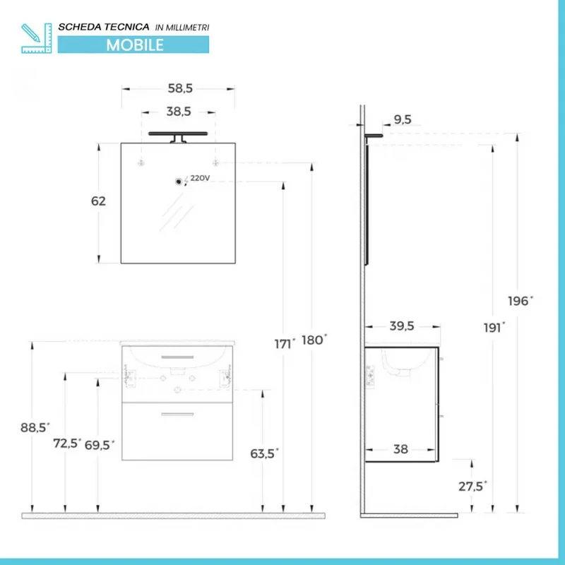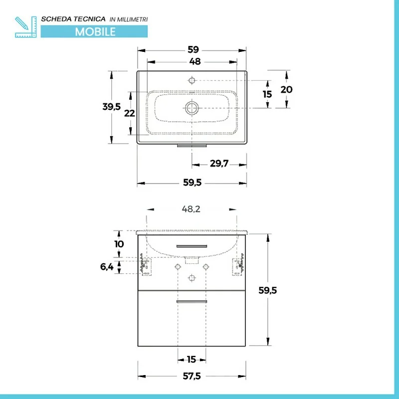 • Dimensioni mobile:L 59,5 x p 39 x H 59,5 cm;