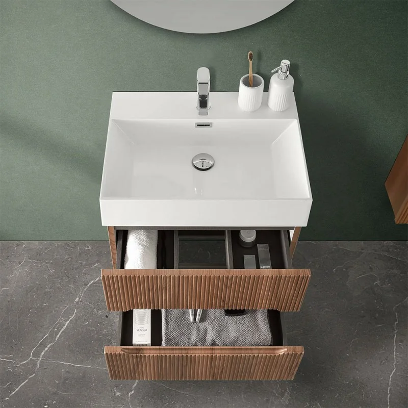 Mobile bagno sospeso – in legno con 2 cassetti soft-close,lavabo in resina e specchio a filo 60 cm