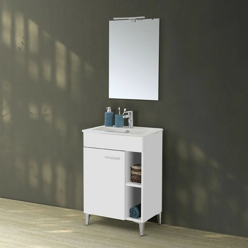 Mobile bagno a terra 60 cm bianco lucido con 1 anta lavabo e specchio  Martha