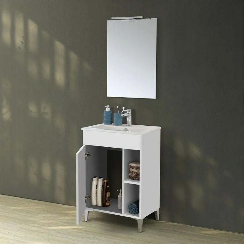 Il mobile bagno salvaspazio è in appoggio al pavimento con piedini cromati e dispone un’anta con maniglia cromo lucido e doppio vano a giorno. La base ospita un lavabo ad incasso in ceramica con foro per miscelatore e troppo pieno;la composizione si completa di uno specchio a filo con installazione reversibile e lampada LED.