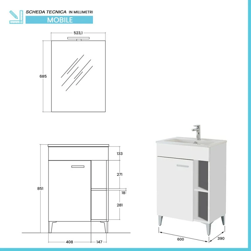 • Dimensioni mobile:L 60 x p 39 x H 85 cm;