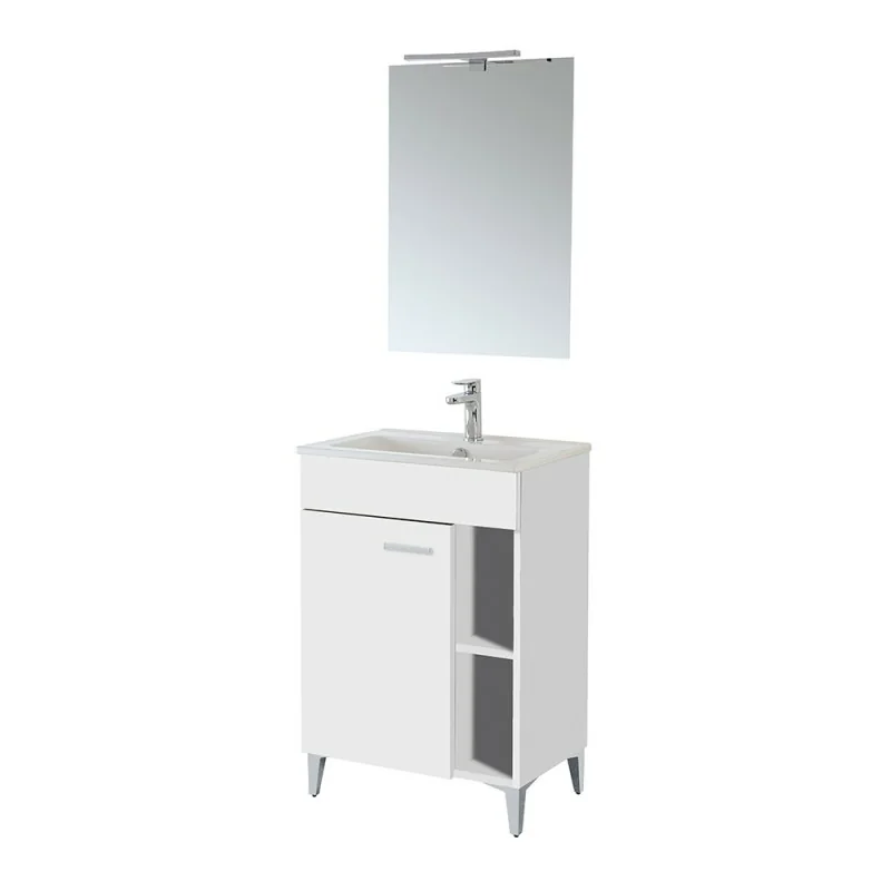 Mobile bagno a terra salvaspazio con anta e doppio vano a giorno,lavabo e specchio con lampada 52x68 cm