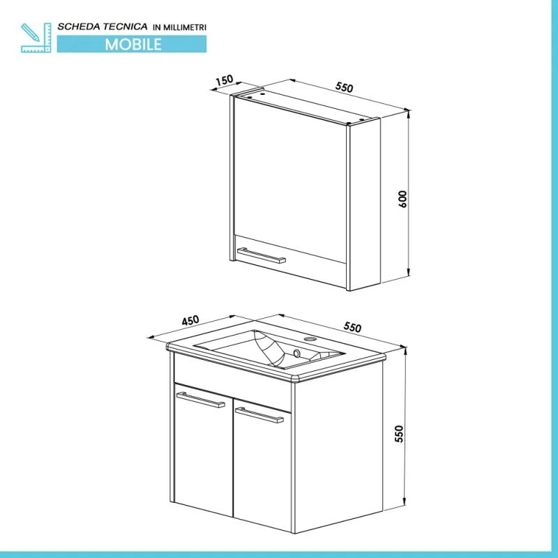 Mobile bagno sospeso con 2 ante soft-close,lavabo e specchio contenitore 55x60 cm