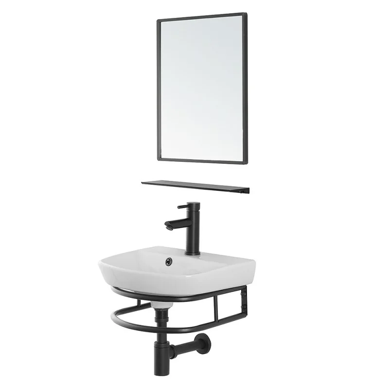 Mobile bagno con lavamani in ceramica,mensola a parete e specchio con cornice nero opaco
