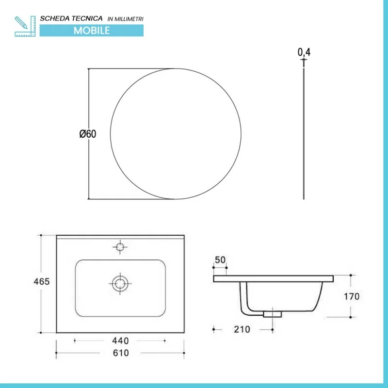 • Dimensioni lavabo:L 61 x p 46,5 x H 17 cm;