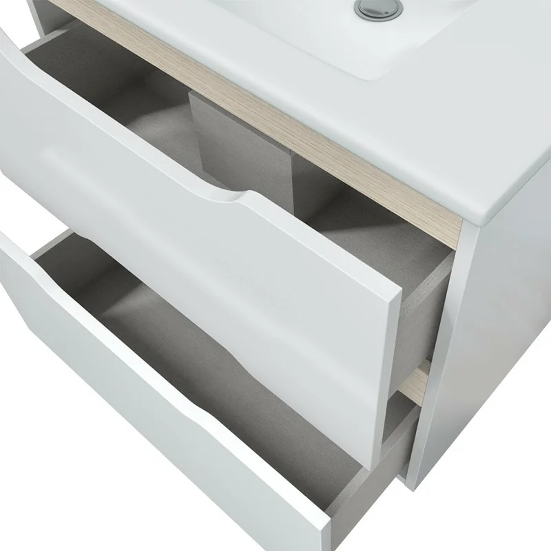 Mobiletto bagno sospeso da 60 cm in legno bianco lucido e rovere Brillo con cassetti soft-close