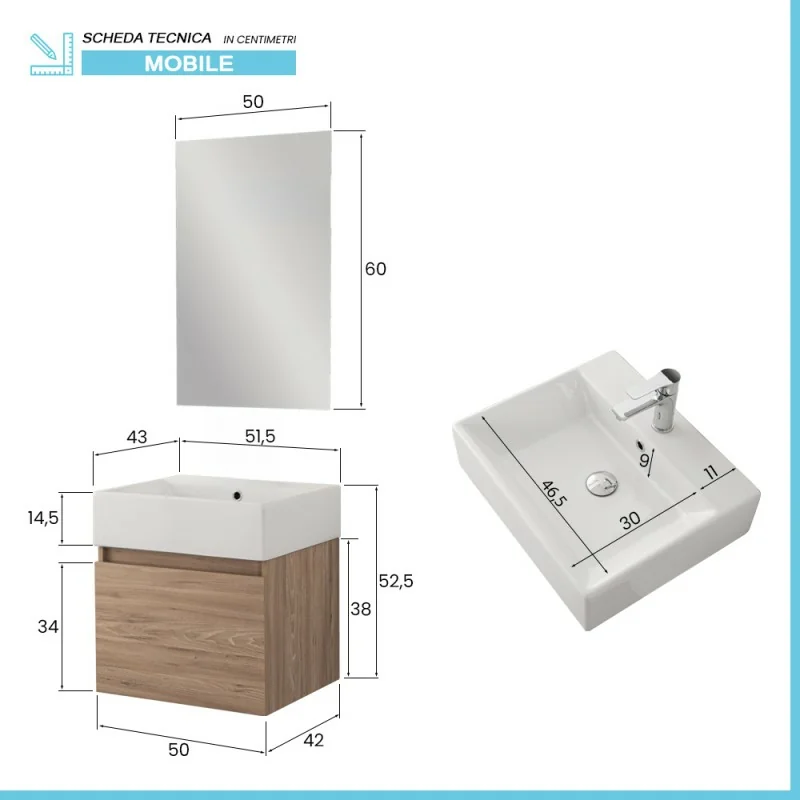 • Dimensioni esterne lavabo: L 51,5 x P 43 x H 14,5 cm;