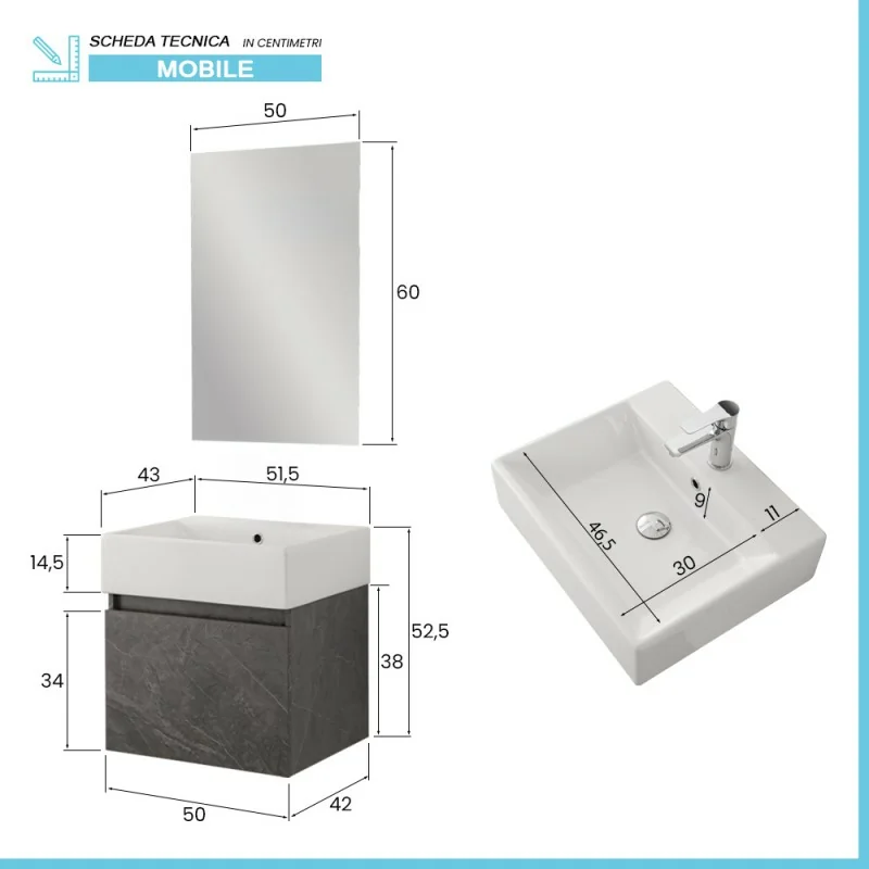 • Dimensioni esterne lavabo: L 51,5 x P 43 x H 14,5 cm;