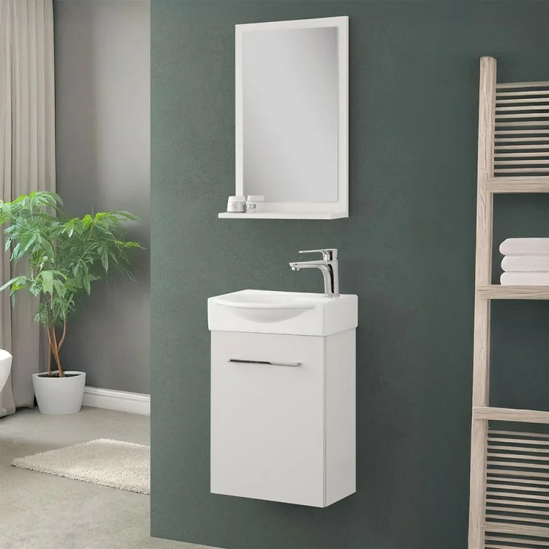 Il mobiletto bagno sospeso Elys è la soluzione super compatta e minuta per meglio arredare toilette dagli spazi ristretti. Realizzato in legno nobilitato è resistente all’umidità e alle abrasioni superficiali. Dotato di un’anta con chiusura rallentata soft-close apribile mediante l’apposita maniglia nel quale vi è il vano interno dove poggiare comodamente i propri accessori. Facile da installare, arriva già assemblato, completo di specchio con mensola e lavandino a incasso.