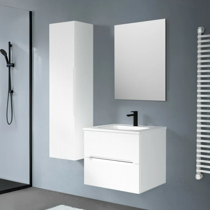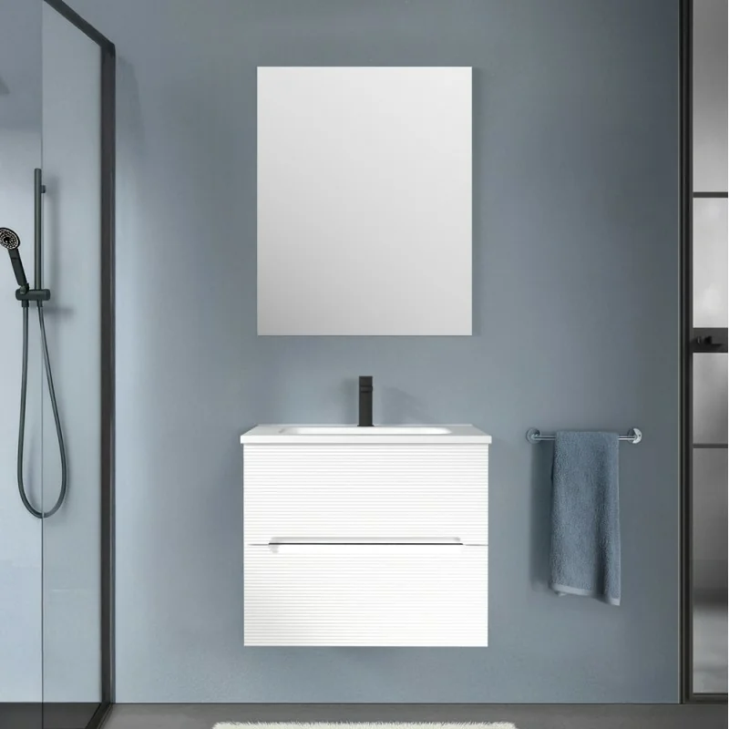 Mobile bagno sospeso 60 bianco cannettato 2 cassetti lavabo e specchio Rigo