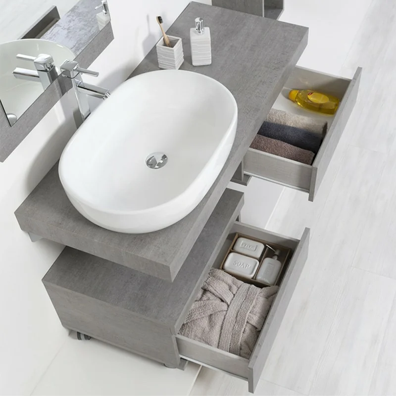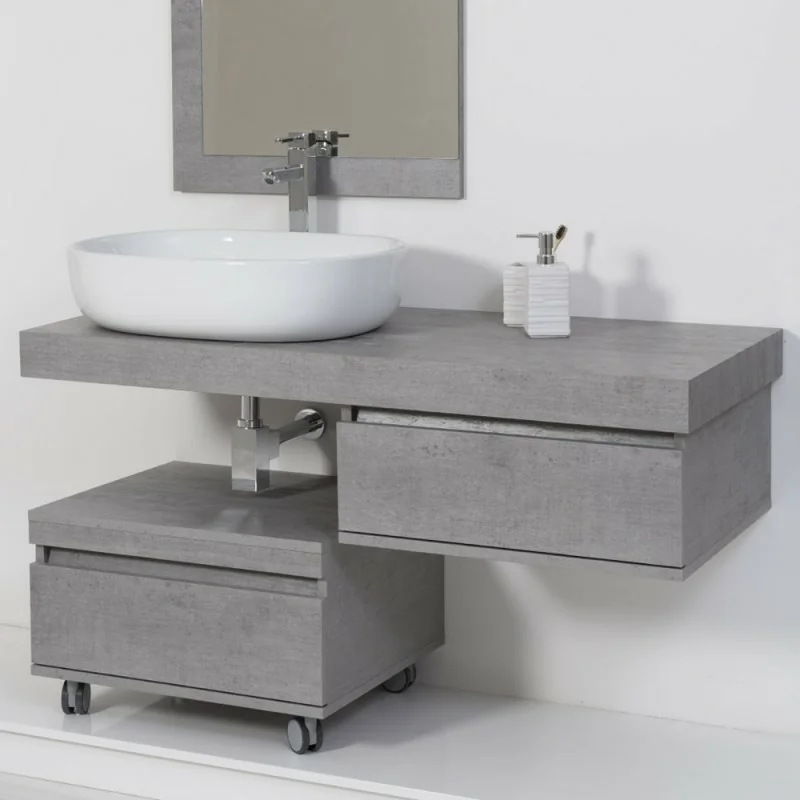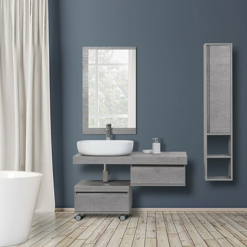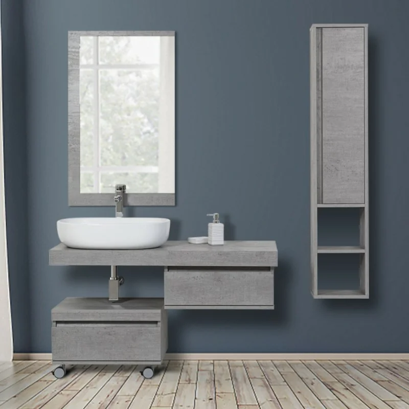 Composizione bagno sospesa in colore cemento con specchio e lavabo da appoggio in ceramica   Composizione bagno sospesa completa che rinnova i...