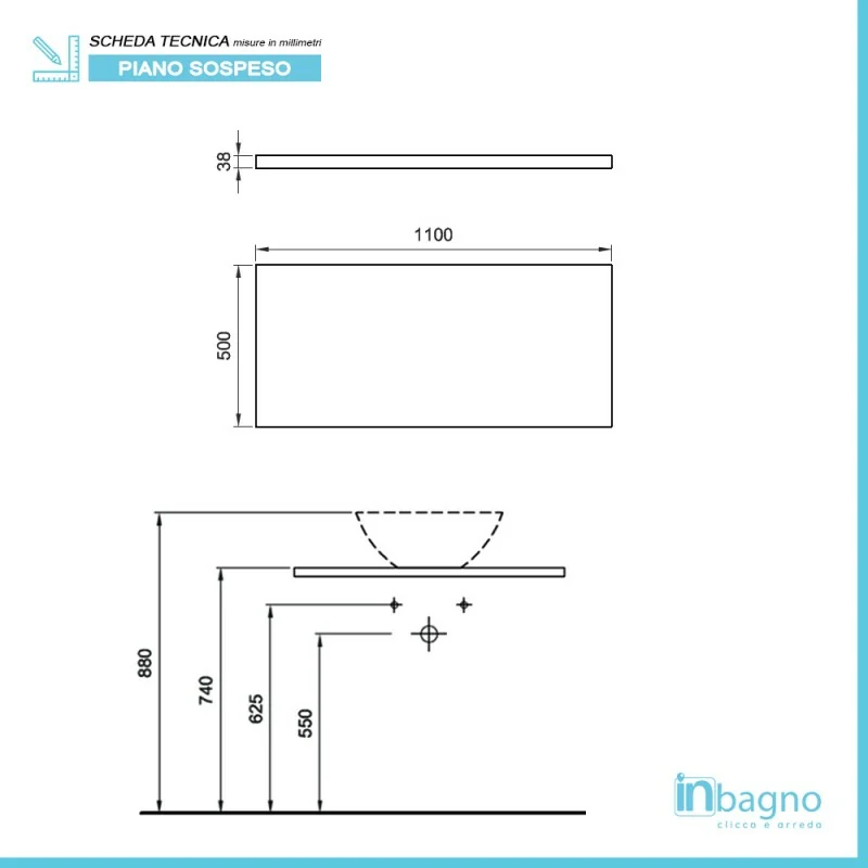 • Tipologia:mensola sospesa da 110 cm per lavabi d'appoggio;