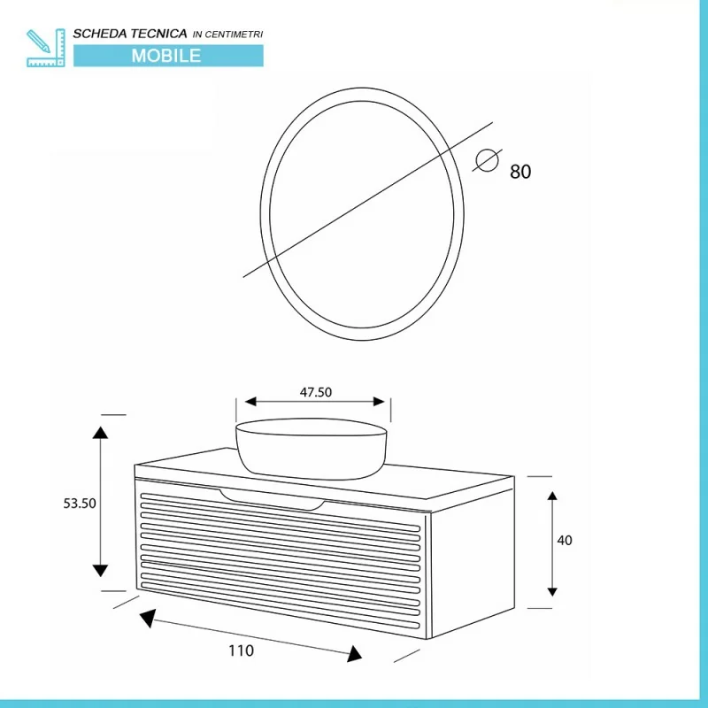 La composizione bagno sospesa si completa con un lavabo da appoggio in ceramica bianca e specchio tondo da 80 cm con cornice serigrafata.