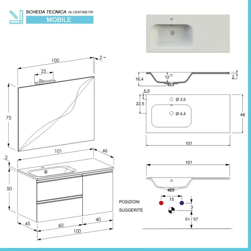 • Dimensioni lavabo:L 101 x p 46 x H 1.5 cm – Profondità vasca 12 cm - Peso 15 kg;