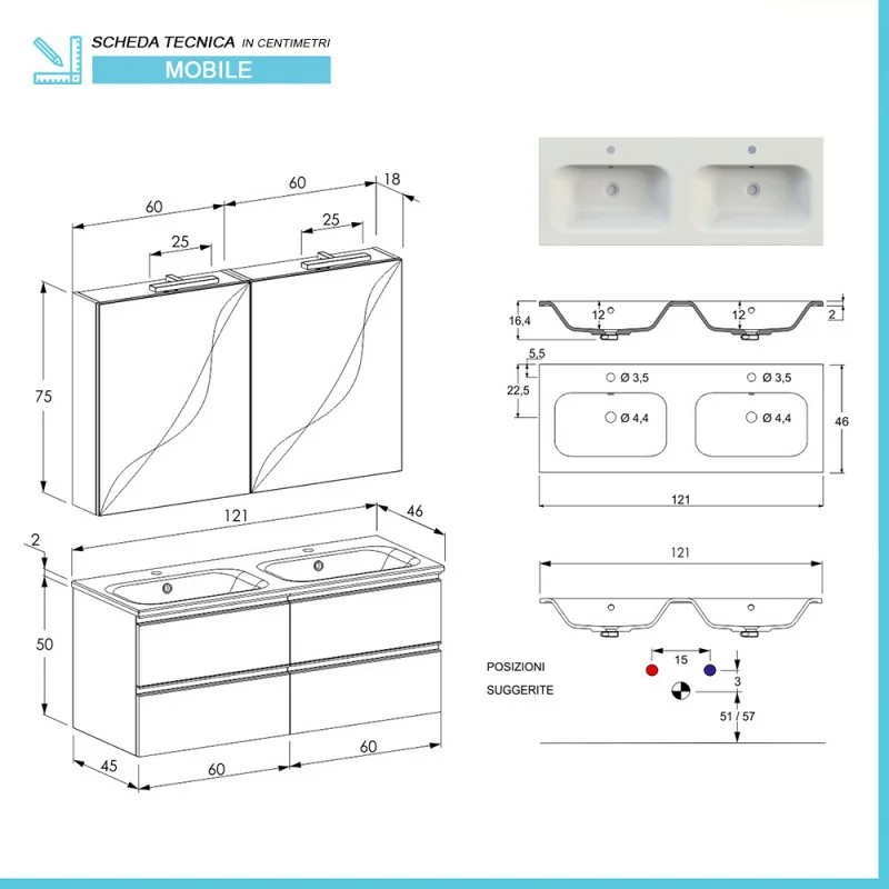 • Dimensioni lavabo: L 121 x p 46 x H 1.5 cm – Profondità vasca 12 cm - Peso 19 kg;