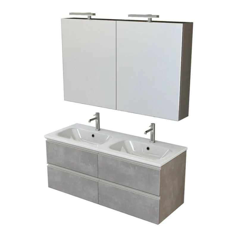 Mobile bagno sospeso Master 120 cm grigio cemento con doppio lavabo, doppia consolle e doppio specchio contenitore con LED