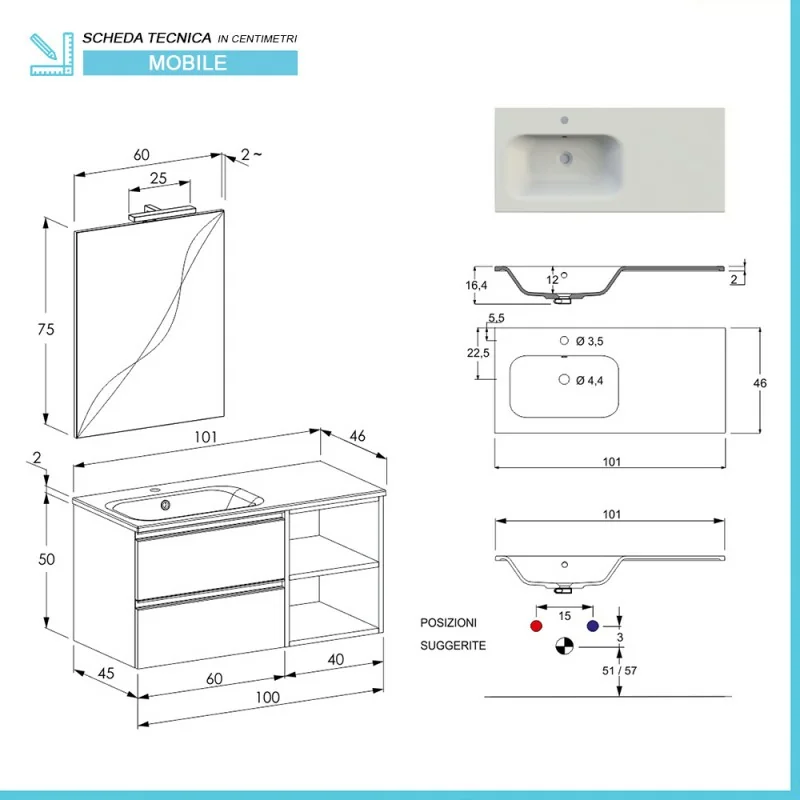 • Dimensioni lavabo: L 101 x p 46 x H 1.5 cm – Profondità vasca 12 cm - Peso 10 kg;