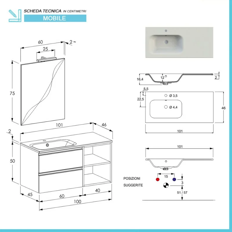 • Dimensioni lavabo: L 101 x p 46 x H 1.5 cm – Profondità vasca 12 cm - Peso 10 kg;