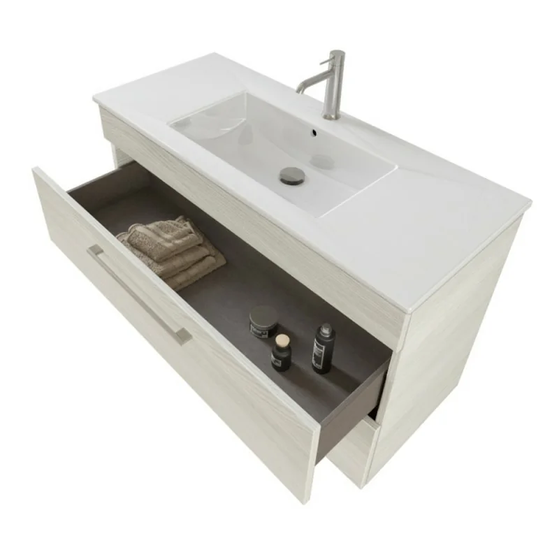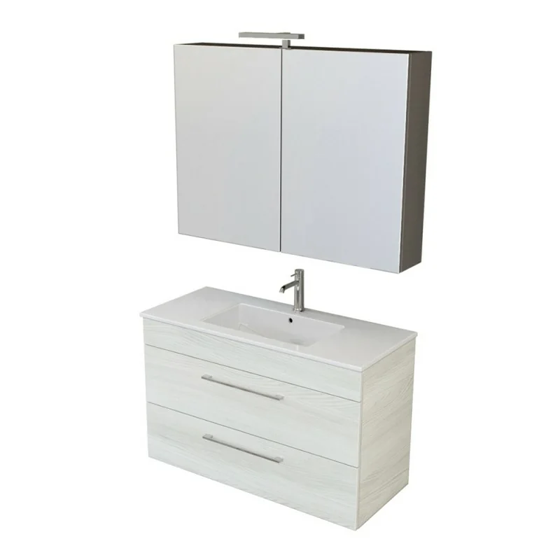 Mobile bagno sospeso – Smart 100 cm bianco effetto legno con lavabo e specchio contenitore