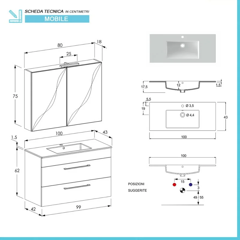 Il lavabo integrato è in ceramica bianca lucida provvisto di fori per troppopieno e rubinetteria. La composizione si completa con uno specchio contenitore 100x75 cm con ante a battente a chiusura ammortizzata,2 ripiani in cristallo ed una lampada LED da 25 cm.