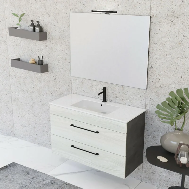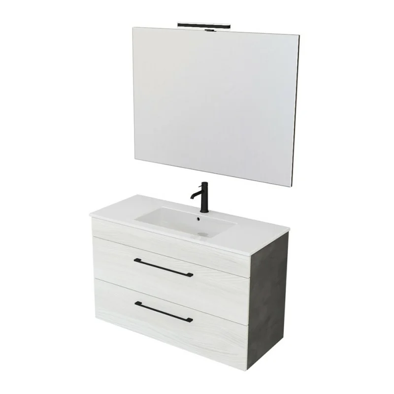 Mobile bagno sospeso – Smart 100 cm bianco effetto legno e fianchi grigio lava con lavabo e specchio