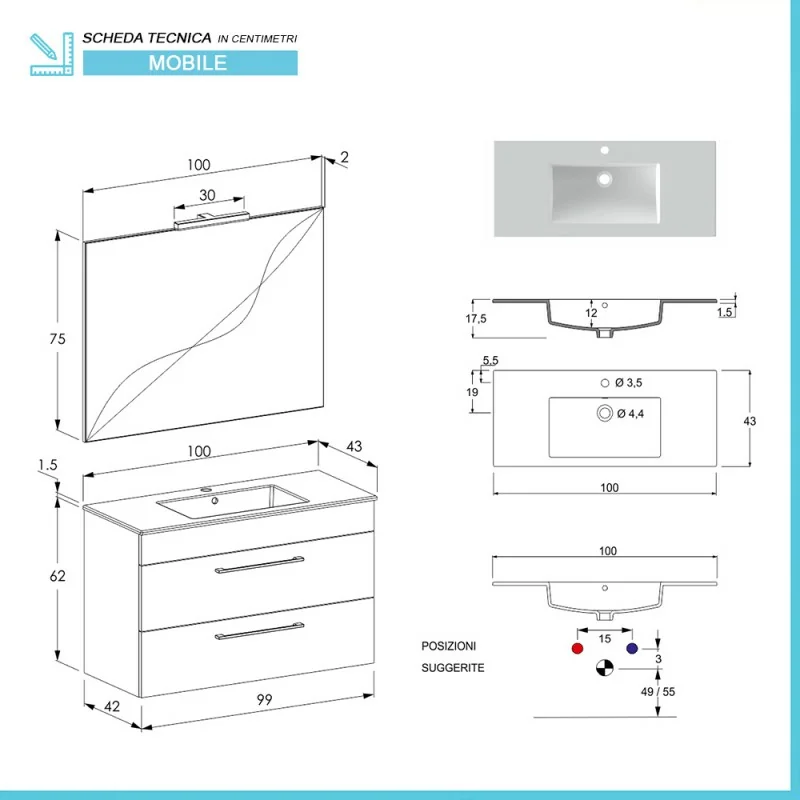 • Dimensioni lavabo in ceramica:L 100 x p 43 x H 1.5 cm – Profondità vasca 12 cm - Peso 14 kg;