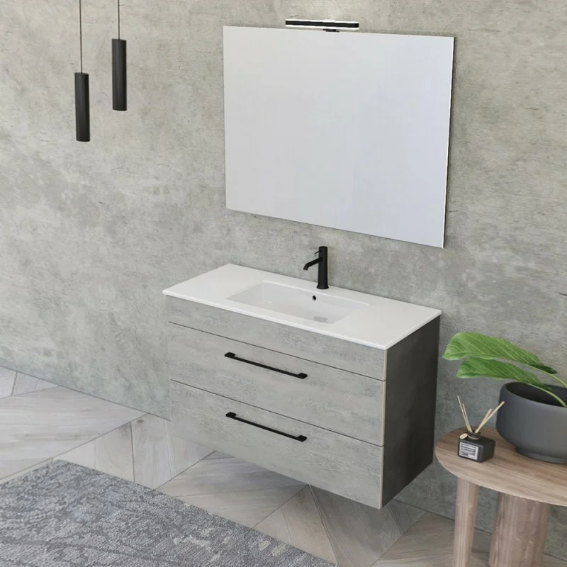 Mobile bagno sospeso – Smart 100 cm grigio effetto legno e fianchi grigio lava con lavabo e specchio