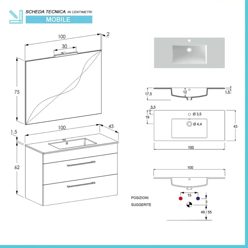 • Dimensioni lavabo in ceramica:L 100 x p 43 x H 1.5 cm – Profondità vasca 12 cm - Peso 14 kg;