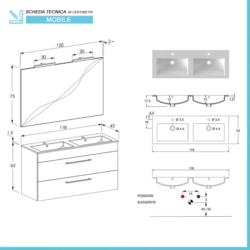 • Dimensioni lavabo in ceramica:L 118 x p 43 x H 1.5 cm – Profondità vasca 12 cm - Peso 19,5 kg;
