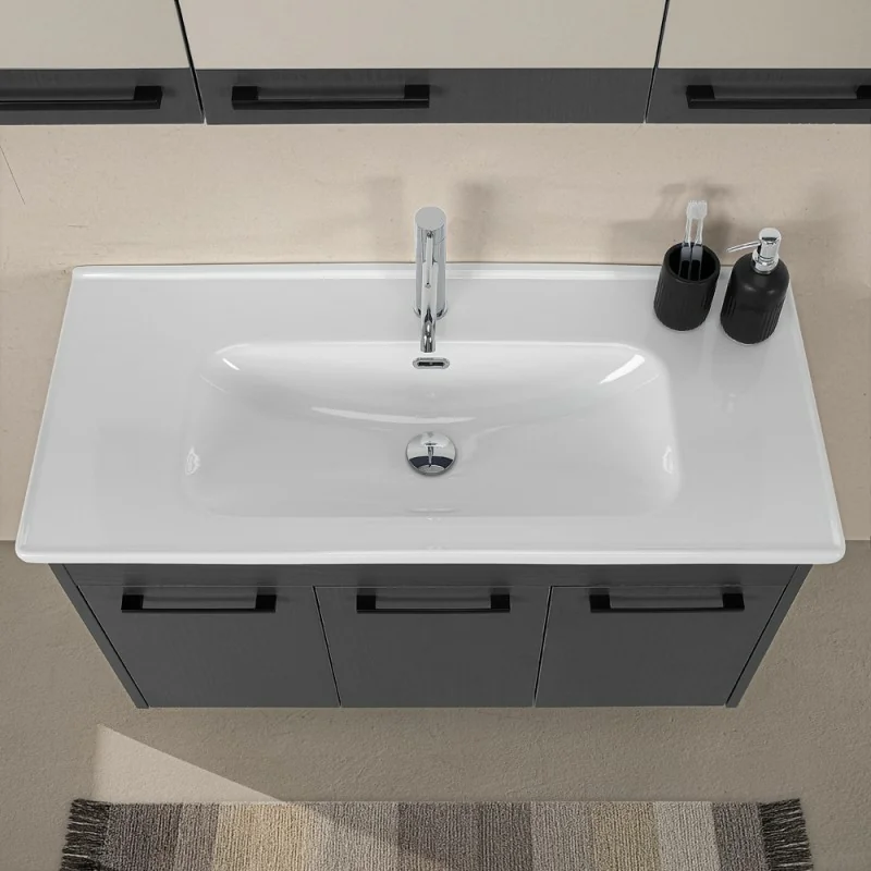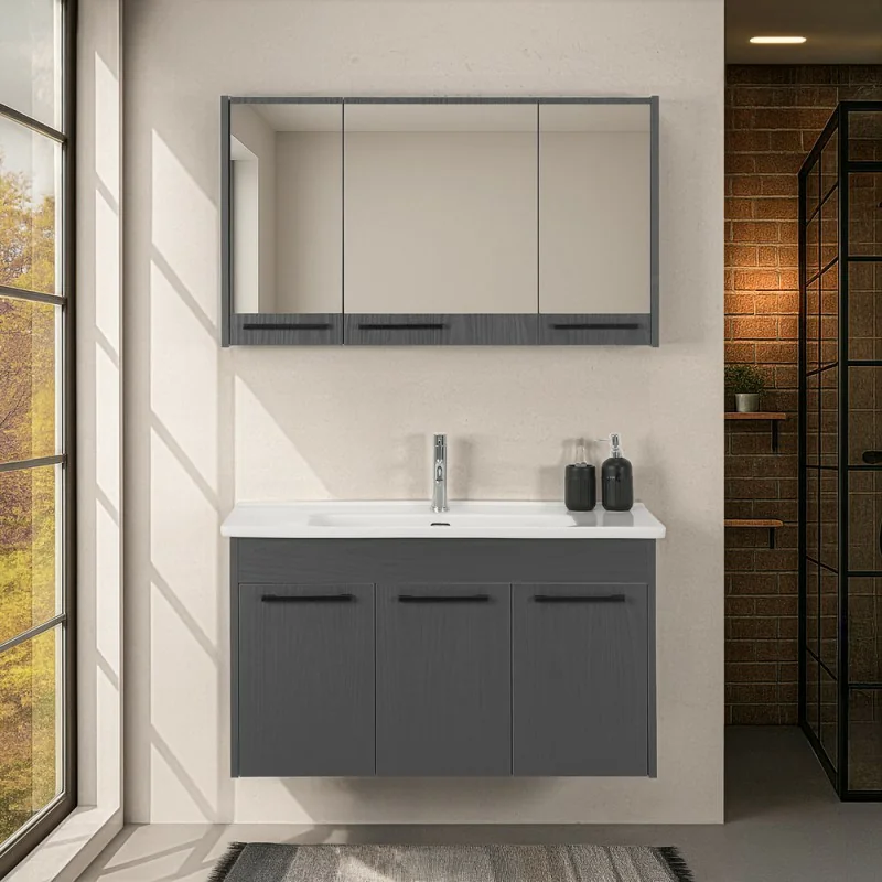 Mobile bagno sospeso L 100 cm serie Sofia colore grigio effetto legno con 3 ante soft-close, lavabo e specchio contenitore