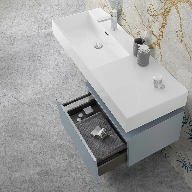 Il cassettone sospeso può essere liberamente installato a sinistra,a destra o sotto il lavabo. La composizione che proponiamo è puramente indicativa. E' disponibile anche in grigio perla.