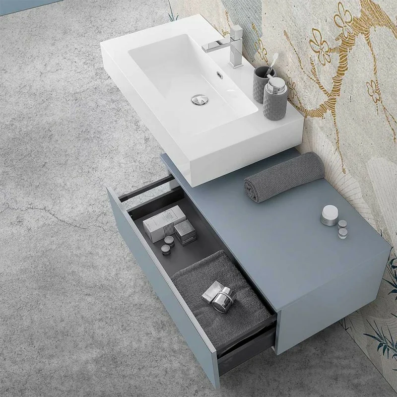 Il cassettone sospeso può essere liberamente installato a sinistra,a destra o sotto il lavabo. La composizione che proponiamo è puramente indicativa;disponibile anche in grigio perla.