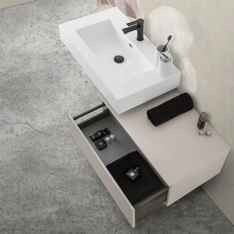 Il cassettone sospeso può essere liberamente installato a sinistra,a destra o sotto il lavabo. La composizione che proponiamo è puramente indicativa;disponibile anche in blu pastello.